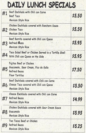 Lunch specials under $5, dinner prices not much more. Love the salsa and I have the menu memorized. Ive been coming to Mexicali since before some of the wait staff were born, back in its old Casa View location in 1992. Just had lunch there today, and the food showed up promptly and tasted delicious. Its within 2 miles of my house, so its home for me. After eating here for 18 years, I can still get bites of food that make me hesitate and think about how *just right* they are. The service is always great and I always get to tell the managers that everything was great. They havent coasted or taken anything for granted in 18 years. I see some bad reviews and I cant help but wonder if the guys that wrote those reviews werent right in the head. This is a no-frills place, take it as it is. Ive loved it from my first taste, 18 years ago.