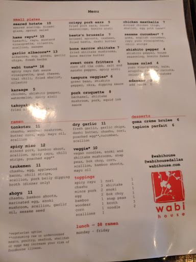 My go-to ramen spot in Dallas! Best noodles Ive had so far that wasnt a 40 minute drive over to Plano. My Asain mom whos been eating ramen for 50 years approves of their noodles, so you know theyre good. If some of your friends arent into noodles or youre not in the ramen mood, their appetizers / share-ables are really interesting and tasty. I recommend their sushi plate. If you just want to try it out, I would go for lunch Monday through Friday. The ramen drops down to $8 and its not as crowded. The only thing that would make me want to give Wabi House a 4.5 stars instead of 5 is that it does get pretty crowded, especially dinner time Friday through Sunday. It is a fairly small place and parking isnt the best, so try to either get there early or call ahead. Maybe not the best place to take a first date if youre coming during those busy times (it does get a little loud and the staff can get a little overwhelmed), but for sure bring friends for some sake or cocktails with some great dinner. Oh, one last thing. Theyre deserts might seem expensive ($6 is half a ramen bowl), but Im telling the truth when I say its so worth it. Ive never had anything like their tapioca parfait before and as soon as I had that first bite, I was smiling.