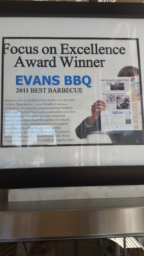 I didnt think anyones ribs could compare to Hutchins in McKinney TX or Fatboys in Cooper TX they are the REAL DEAL smoked ribs not the sh;tty bakers, soulman dickies crap. Evans ribs are great but Fatboys are still the king. Ill be stopping at Evans every time i pass through DeSoto TX for a slab of ribs period!