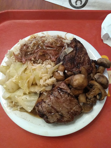 We will not be returning, ever. My husband and I have been big fans of Golden Corral since childhood and were excited to try the one by our new home. Complete disappointment. The price for two people for dinner with 1 drink and 1 water and it cost us $30. First red flag. The cashier laughed at us when my husband asked if they offered a military discount. Insulting. My first plate included the Bourbon Street Chicken, the flavor was good but it was cold. Second red flag. The cook behind the line gave my husband a substantial amount of attitude when he asked for a medium-rare steak after she cut the one on the grill and it was over well done, the attitude continued when he went back to see if it was done. Third flag. We couldnt even eat the steak he finally did get because it tasted terrible. Everywhere I looked I saw employees huddled together chatting, meanwhile, we only saw our server twice and there were only 4 other tables there the entire time we were there, and my husband had to go and get his own refill. I also witnessed an employee cutting veggies with her bare hands and placing it on top of the veggies already on the bar, so there is no telling how long the stuff on the bottom has been in that container. The food tasted like low-grade, middle school cafeteria food. They even managed to make plain corn taste awful. The mashed potatoes and rolls were the only thing worth eating, definitely not worth $30.