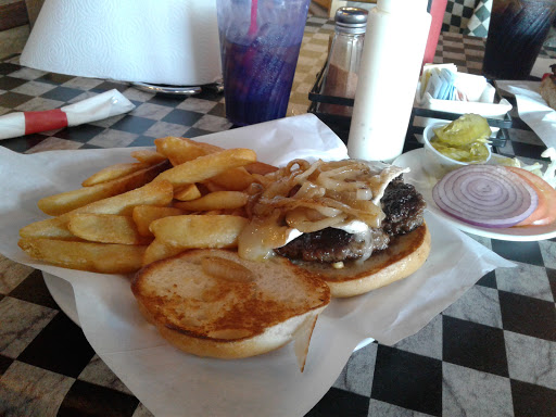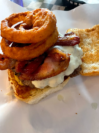 Excellent food, outstanding service. I am not really a burger person but this was amazing and Im going back again and again. The burger was hand-made and fresh, not frozen, thick and well seasoned and cooked perfectly. The bun is a slightly sweet sourdough with just the right amount of give (necessary because you have to squish it down to eat it, its huge). Toppings were fresh and tasty, the menu variety was excellent, the fried pickles were good, the vanilla shake was hand-made with local ice cream. And they have turkey burgers and veggie burgers too! Wish Id had room for more but did I mention the burger was huge?