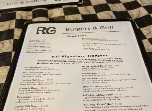 My wife and I visited RG because we had a Groupon for their Denton location. The waiter was very attentive and the burgers were great, but the fries were undercooked. I mentioned it to the waiter and he said hed mention it, but it sounded like that is how they cook them. The burgers average $7-10 and include fries. Good place to eat, just order your fries "extra crispy"