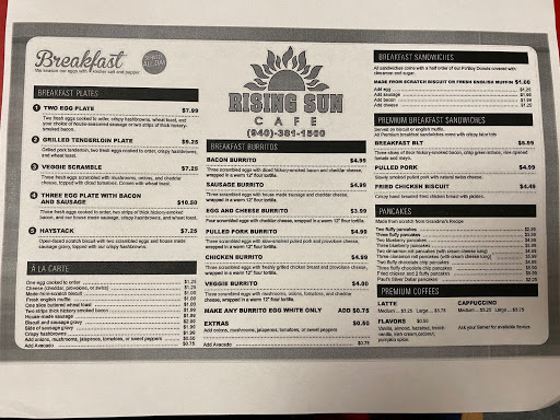 Great quaint little restaurant. Off the beaten path a bit. If you want a good breakfast on a Saturday or Sunday morning and dont want to wait an hour come to the Rising Sun Cafe. Great service good food HOT FRESH COFFEE!