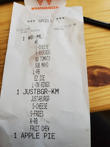 The employees at this restaurant DO NOT CARE. Ive never been to a restaurant where the workers decide for you what youre going to eat. But, apparently at this location thats what the employees think they should be doing. Theres no excuse for having my correct order on my receipt and receiving completely different items as if they just threw whatever they had into a bag and handed it off to me with a smile. Whataburger basically stole my money today. Very disappointed.