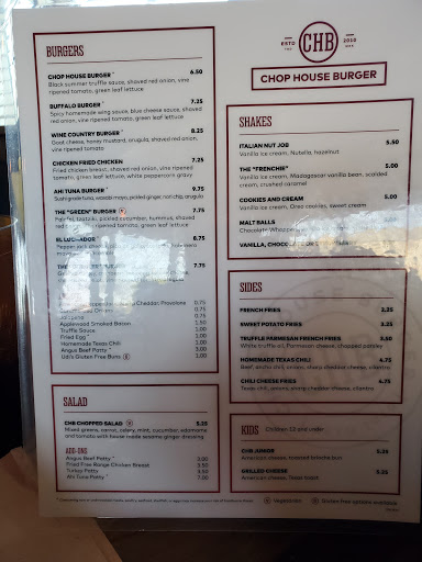 My wife ordered a chop salad and requested bacon bits on top. They charged an extra dollar and brought her two slices of bacon next to the bowl of salad. I ordered a chop house burger and wanted the regular onions grilled instead. They wanted an extra dollar for grilled onions. Their prices are unreasonable for their quality, and Im sitting on the toilet right now squirting my brains out because their chili is made from ground dog food. Please save yourself the car payment-like expense and go to whataburger or in-n-out.
