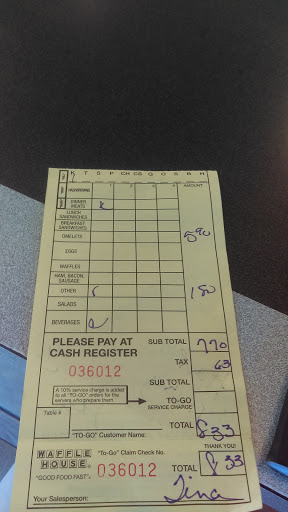 Let me tell you about this Waffle House! We waited, and waited for 20min just so the waiter could tell us know that he had no pork.chops. We were the only table and he left us waiting. Why! I dont know! But i wont be going back for a while