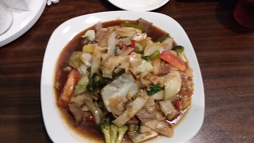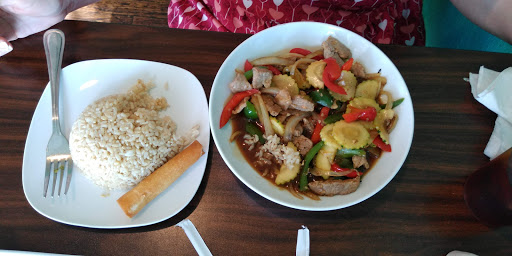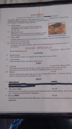 Cute and quaint little place, with good hours and located next to the Laquinta where I stayed. Got a carry-out order of Sweet and Sour Thai Style with chicken entree, Thai spicy. There was no chicken, no where near the Thai hot Ive ever eaten before, had something crunchy in it that Im not sure what it was (maybe realllly over cooked chicken?) and just simply did not taste like a Thai entree. Although it didnt taste bad, II wouldnt return for a Thai craving entree. $10 for the entree mentioned and pictured with this review...