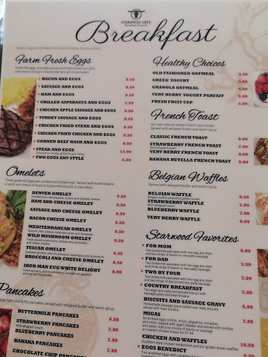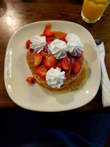 Was glad to find this restaurant in my area especially somplace that serves breakfast . IHOP, cracker barrel and the like are never my first pick if I can find a nice family owned enterprise. Today was my first trip here . They had some traffic but not packed so I did not like it when the host, though pleasent , did not ask where we wanted to sit. We did ask for a different table. Our waiter was cheerful, well groomed and polite . He seemed really polished and I could see him working in fine dining. A pleasent surprise. We placed our order and the food arrived quickly. The breakfast was good though I did not care for the thick smoked bacon . It also seemed a bit under cooked. The pancakes were thick and fluffy . Good but I like a thin pancake. One detail I LOVED was they serve real butter for your pancakes at room temperature! The beautiful butter oozed perfectly over the hot pancakes. A little thing but so nice . The atmosphere was cheerful and the decor tasteful but fun . I think however they should select some lighter music . Im not a fan of old heavy metal and rock . The music did not reflect what the rest of the cafe seemed to project .Having worked in the food and beverage industry before I think the music selection might have been the chefs choice . I really liked this place overall so Im looking forward to going back and try something else on their nice menu. I also like that they have focussed on breakfast and lunch only . A limted menue usually means a better product . Glad we found Starwood Cafe !
