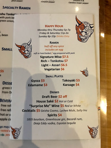UPDATE: We gave it another shot on a Sunday afternoon, and had a much better experience. The menu has better clarified which entrees contain shellfish, which entrees can be vegetarian, etc. The service was quick and thorough. I had the tuna poke, which was excellent, and my girlfriend had a vegetarian ramen that was easily the best weve had in Fort Worth. A completely different experience from the one listed below. Great job Oni! ~~~~~ Original Review: Had pretty high hopes after reading the reviews, especially after being repeatedly disappointed with the locations previous restaurant, Kin Kin. But first, the positive. Decent happy hour with great edamame and decent cheap sake. The main bowls of ramen are a dollar or so cheaper. There are a few vegetarian and pescatarian options. The vegetarian was good. Much more flavorful than their signature miso. Granted, I think they messed up my order and gave me the light ramen with no added spice; however, our ticket still contained the more expensive signature dish. The real issue is that the meal they gave me had shellfish in it, and Im violently allergic to shellfish. The meal I ordered had no mention of shellfish or seafood in the description and they did not ask about dietary restrictions when we were ordering. When we asked and they confirmed, I explained my situation. The waitress apologized quickly and... that was it. No comped meal or replacement. No apology from a manager or chef. Having worked on the other side of the dining experience, I decided it wasnt worth making a scene over what could have been a medical emergency. But I will not be eating at this establishment again. And Im sure anyone who orders whatever I had probably wont be thrilled, regardless of their dietary needs.