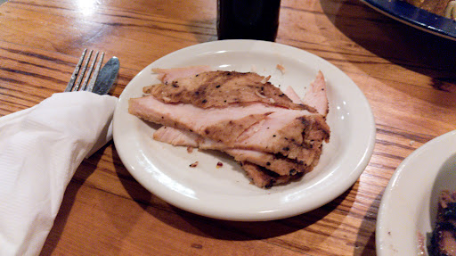 Its your typical take at trying to be a country style restaurant. The decor is pretty cliche and with your deer head and other things as such. It is a sit down, full service style restaurant serving other fare. I ordered the 3 meat with sliced beef, pork ribs, and chicken accompanied with corn, fried okra, and mashed potatoes. The brisket was bad, it had no proof of being smoked with wood, no ring, no flavor, no crust. It came sauced and slice way too thin (to cover up the dry texture.) It was so dry I declare it not edible. The ribs had potential, baring a nice sweet crust. They were simply overcooked, but as I said the flavor was there. The chicken also had a nice flavor, but was dry. The sides were actually really good, all made from scratch I assume.