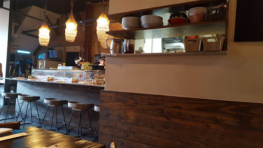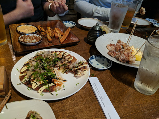 I really dont recommend this place. At first I wanted to give it at least 2 stars but as I wrote on I couldnt find a reason besides it seemed clean. They tout being an izakaya but when you get there it really isnt. It reminds me of an American Japanese restaurant with all the Americanizing up front. I think the waitress described it better when she called it a gastro-pub, a fancy way of saying they serve food as well as alcohol. Yes they have sushi. Yes they have Japanese beer. No it doesnt feel Japanese at all. For those of you who dont know, an izakaya is a place you go to hang out with your friends, either at the bar or at a table, which usually takes longer and almost always requires a reservation (which they dont typically do without a guaranteed sale minimum). You order a beer and a bite and chat for a while, then repeat a few times. This place is more like a restaurant where youre in and out and chatting is done somewhere else. We were there for less than an hour and even then we felt rushed. The waitress actually started taking dishes off of the table before we were done eating. As for the cost, it really wasnt worth it. If the atmosphere has been better then it still would have been a little high considering the quality and quantity of food. If youre still wanting to go, the parking is at least convenient if not somewhat crumbling in places. We may have actually parked on gravel. They are located in a fairly new area. There are a few outside gas fire pits which make for nice places to visit while waiting for a table.