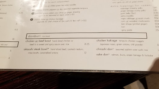 Love the food, and the atmosphere.... service is spectacular. I prefer going at lunch; both the menu and prices are better.... The BYOB (Build your own Bento) is excellent, as is the chirashi-don. I liked the chicken kakiage a lot, but it was WAY too salty, apart from that, amazing dish. For dinner time, the food was tasty but too overpriced for the amount of food... I cant generally afford to eat here for dinner, its sister Tokyo Cafe is my preferred dinner spot. The okinomiyaki (I dont know if its on the menu now) is the only place to find this dish in Fort Worth; it was decent enough if youve never had it before, but the ones I make at home are much better. Im dying to try the sake steamed mussels. The cocktails are FIRST RATE.