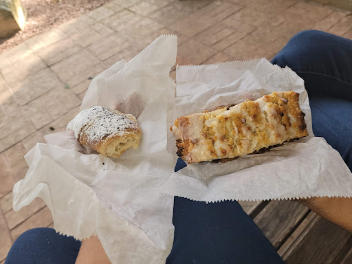 The food is tasty, but not excitingly so, just a great solid spot for a hearty meal. I had the chicken sandwich, and the pretzel roll really elevated what was an ok sandwich to something even better. My friend had the bratwurst and enjoyed it. The warm potato salad us definitely recommended! This place is crazy busy, even at 2pm on a weekday. We werent quite sure if we needed to wait to be seated or if we should seat ourselves... if youre a first time visitor it is a bit confusing. I had to track an employee down who informed me we seat ourselves but we had to stand next to a table waiting for it to be bussed from the last patrons. We picked up one of the pastries with raspberry and bavarian creme which was amazing. The atmosphere is casual, loud, and chaotic!