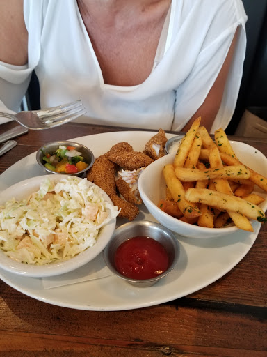 I brought my daughter and mother here after a session of swimming lessons for my daughter next door to here. We walked in and they had just opened for the day, so we sat down. The first thing to comment on was how small the table/booth was. It just seemed cramped. This thought was quickly deterred by the neat characteristics of the restaurant: The mason Jar lights, detailed antique canvas pictures on the wall, and we noticed how clean the floors were (yes, they just opened, I know). We werent super hungry so my mom and I split the Southwestern Salad (added chicken for an extra $4) and my daughter got a kids cheeseburger with fruit. The food was a bit pricey, but such is the area, and it was delicious. We very much enjoyed the salad, but thought it should have been a $10 salad, not $15 salad. Our waitress was very pleasant. We would definitely go back. My daughter went to the bathroom before we left and were very impressed with the character and detail of the bathroom- again very clean.
