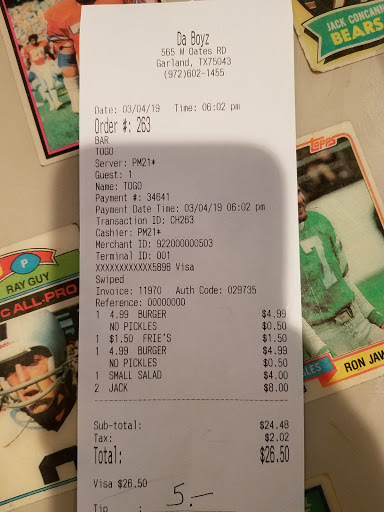 Where to start...This place is brand new inside and out. Has flat screen HD TVs everywhere you look including their outdoor patio. And the food...it should be a sin to even call it bar food. If your looking for a great sports bar and grill in the Dallas area to watch your favorite team, then Da Boyz Sports Bar and Grill is one to certainly check out!
