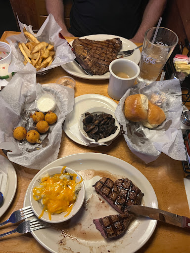 Amazing food. Great atmosphere. Great service. Had to wait about 15 minutes to be seated, with no reservations. Totally worth the wait!!! If you like ribs, youll love these "fall of the bone" ribs. Also, Ribeye was delicious. Fresh salad. Awesome, bottomless rolls. Green beans with bacon, chili with steak and ground beef mixed in. To die for. Overall great experience.