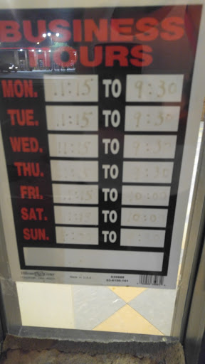 | Working: | 11:15AM–9:30PM 11:15AM–9:30PM 11:15AM–9:30PM 11:15AM–9:30PM 11:15AM–10PM 11:15AM–10PM 4–9:30PM |