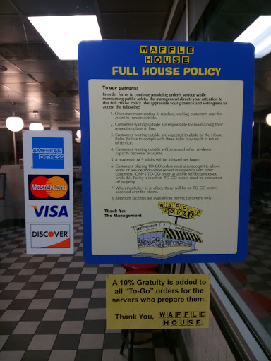 I was having to stay at the hotel next door, so I galled to place an order, was asked to hold and then for 5 minutes I listed to the staff cut up and count a drawer before I hung up. This is rude and unprofessional that not one person could take my order. So its been a few days later and decided to give the Waffle House a second chance, this time I was told I could place an order, but when I tried I was told they didnt take hamburgers and stuff over the phone, then was hung up on. The reason I am giving them 3 stars is that when I complained to corporate, within a short time the head manager called me asking what had happened, which I was able to tell him and at what time it happened. He gave us a 15.00 gift card to use at anytime, apologized and was working to find out who had done this and to straighten things out. For Johns fast approach to fixing the situation I am giving them 3 stars