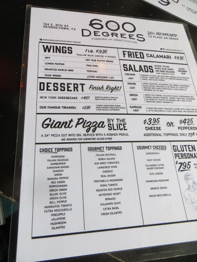 Delicious menu!!! Tasty pizzas, salads and beers! Huge portions (everything!) and fantastic prices! I was in Georgetown for a wedding and no joke I ate three times in two days! First night, my mom and I had no idea to go in Georgetown TX so we went with a good ol Yelp recommendation and it we were so happy we did. We shared a house salad and 14" half cheese / half bell pepper (we were boring, I know), 1 large slice of pepperoni (practically the same size of the 14" and only $3.75!), 1 Belgian white beer (several tastings prior to) and 1 glass of Sauv Blanc. Our total before tip was $39.00...WOW! What a steal! Everything was made to perfection and tasted so good! And the service was outstanding! The following night was the rehearsal dinner at a nearby brewery and guess what was for dinner...600 degrees pizzas! They had order about 20-30 pizzas and everyone loved it! Unfortunately, my boyfriend was too busy chatting that when he finally got around to eating there was nothing left so when we left the only place in town that was still open was 600 degrees, of course! This time him and I shared a house salad, a 14" Palo Alto / Haight-Ashbury pizza and a large cheese slice to go, along with a beer and glass of wine. Our total bill was $44.00...SCORE! Very lively and friendly atmosphere! Its a pretty small restaurant there are high-top booths and some tables inside with a small bar but large drink/beer menu and a couple TVs with some sports games on. Theres also a lovely outdoor seating area with a couple two-person tables and about 4-5 large picnic tables and benches. Service is fantastic! People are super friendly! Food is delicious and beers are tasty! HIGHLY RECOMMEND to everyone, of all ages, that are in and/or around Georgetown, TX. You wont regret it!