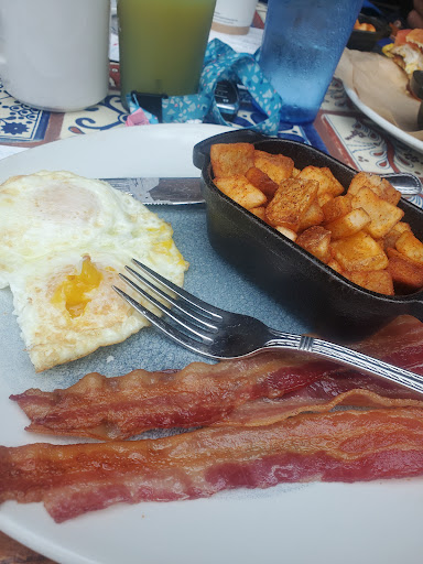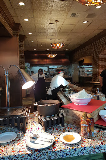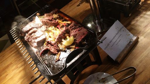 The setting is nice & open along the riverwalk in the Gaylord Texan Resort. Lots of great views, but noisy as you would expect under the Atrium. I ordered the Halibut off the days menu, but they did not have it, so I had the Ribeye steak. It was very good steak, very tender. It came with potato fingers, but I asked to substitute for roasted new potatoes. The waitress said that would be done, but it came with very thinly sliced finger potatoes, buried under the steak. Did the chef think I wouldnt notice, or did my request get lost in translation? I did ask for a small side salad, which was included at no extra cost. But then, I would expect so with a $36 price tag! Because of the inconvenience with the menu, I was offered a free desert, a slice of 3 layer slice cake with whipped cream between & a hint of strawberry with the cream on top. I would have loved it if it had included some nice slices of strawberries, in a suitable amount. The staff was courteous & tried to be helpful, but I struggled with the Spanish accent. I confess that I felt more like I was in Mexico than in the US. Although the staff was pleasant, they seemed to expect me to understand their language, weaving Spanish words with English, then translating only if asked. Overall a good meal, but definitely not worth the price tag!