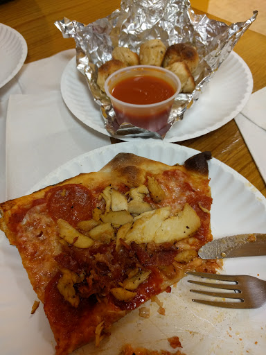 Really enjoy the pizza here. You can get it by the slice or a whole pizza. Try their garlic knots from the counter, theyre tasty and youll order some for certain. I like getting the pepperoni slices and add bacon and chicken... Delicious!