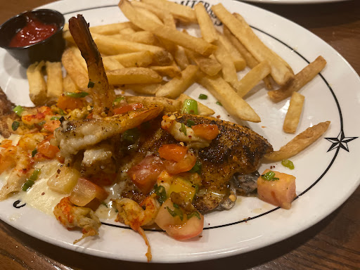 I thought the atomsphere was great as you could feel the vibe of the place and it was a happy feeling of lots of people having a good time and eating good food. The food was good I have filet 6oz my friend had the same plus BBQ shrimp. We both found the shrimp dish had a little more salt than we like but offer all was quite pleased