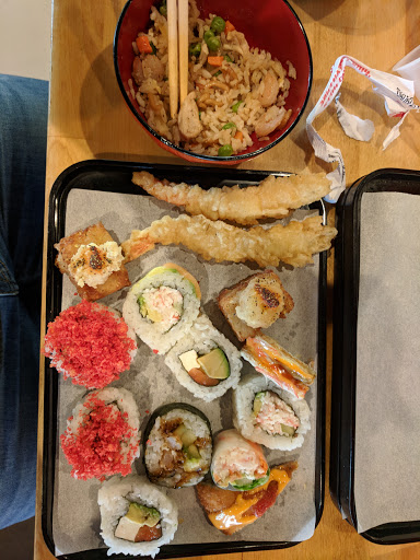 The all-you-can-eat lunch buffet is great! I took my 11 year old son and 18 month old daughter, who both enjoyed the rolls, tempura, salad, soup and frozen yogurt. The rolls are well stocked, nicely presented and there are lots to choose from. The pineapple-mango-strawberry rolls are a nice surprise. I like that you can add your own tofu and seaweed to the miso soup, so everyone gets it the way they like it. You have to try the grilled chicken skewers! Crab stuffed tempura jalapenos are good, too. I like the bright, modern atmosphere; nice music; and large TV. The restrooms are clean and have a cool decor. If the weather is nice, there are tables and chairs outside.