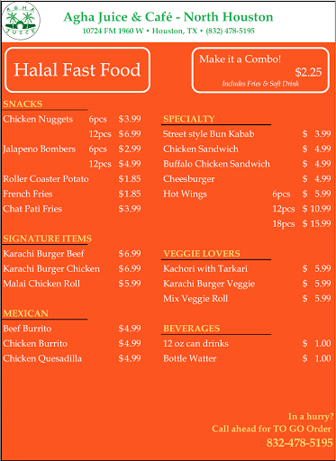 I love this place! These guys are awesome...finally an Agha Juice that accepts credit cards, unlike the sugarland location! What can I say, the food is always outstanding, the shakes are to die for, and the decor is so amusing, especially the big collage of glimpses of Pakistan. Great job guys, keep it up, God willing!