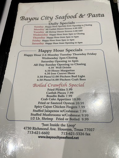 I love crawfish and have been going here non stop. Their crawfish size is consistent, rarely I get very small ones. Most of them are big ones, sometimes jumbo size. The freshness cant be beat, and the taste is always constant, on the good side. The prices are also the cheapest in town. They used to charge $3.95/lb on their Happy hour which is almost daily between 2 pm to 6 pm, but on Wednesdays and Sundays, the Happy Hour for crawfish is all day. However they just recently upped their price by $1, so now its $4.95/lb. Its still cheaper than anybody else. Ragin Cajun charges $6.28/lb and I went there several times to the Richmond location and sometimes I swear they forgot to put any seasoning. No taste at all. Magnolia Grill charges I believe $5.99/lb. Boiling Crab charges $6.99/lb and Cajun Corner charges $6.99 also, but dont go to Cajun Corner if you want to be disappointed in their size. TINY TINY crawfish...their flavor is very good though. Bayou City Seafood also has GREAT pasta, very creamy and tasty sauce, dont forget their Crab Bisque too. Yesterday I ordered crab bisque and for the first time they tasted bland and was on the runny side. Usually they are very thick and tasty. Ill try again next time. GOOD CRAWFISH RESTAURANT OVERALL. I will Continue coming here as long as they dont keep rising their prices.
