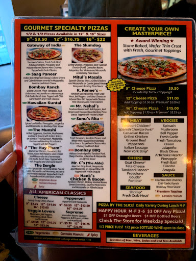 Im impressed with the quality Bombay Pizza Co. had offered my co-workers and me when we arrived at our company meetup in August 2012. I love eating Indian food, so when I discovered that a pizza restaurants topping specialties are particularly just that, I knew this place would be a great spot for us to enjoy. I ordered the Saag Paneer pizza, while my co-workers had gotten the Berry Bombay and the Bombay Ranch. All the specialties were delicious. Interesting crunchy thin crust, rich cheese taste, fresh-tasting ingredients, I really want to eat again and again had it not been so expensive. For my co-worker with the Bombay Ranch, she specifically asked for the cilantro to be removed, so they had to re-do the pizza and remove the cilantro and she had to wait longer, although it wasnt a big deal since we shared pizzas with each other. I had a great time with my co-workers there and spent 3 hours talking about work and whatnot, and we just enjoyed the atmosphere all the while. I do not live in the Downtown area, nor do I commute/drive to work there, but I will visit the Sugar Land location more often since it is closer. Thanks for the ambiance and great Indian pizza!