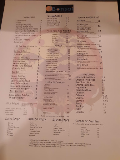 I used to be a regular customer at Bonsai, but not any more. Apparently, they have a new cook or a new management. Their rolls are the smallest rolls I ever seen with little to no fish in them, mostly overcooked rice.