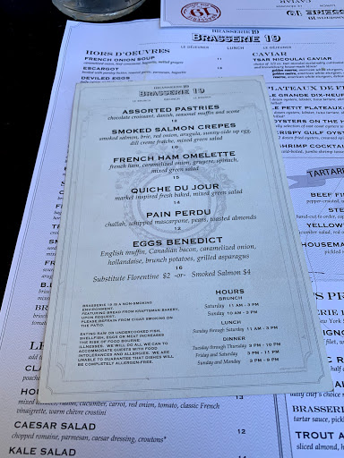 It was date night without the kids so we decided to try Brasserie 19 since we had a gift certificate. It turned out to be a great night and we walked away very happy with the experience. We came on a Saturday night and there is plenty of parking not too far away. The shopping center around the restaurant is brightly lit so you dont have to valet if you dont want. We are not big on wine but I can appreciate the unique approach of bringing out an iPad to help you select your wine or cocktail. It has great detailed descriptions of everything. Its too bad the app they use is very slow on the iPad and it takes you a long time to browse the selection. It would still be much faster to flip through a paper wine list. We started with the escargot and French onion soup. The escargot came out with a flaky pastry layer on top that made me think it was chicken pot pie. Dont get me wrong, it turned out to be a perfect complement to the escargot. They had a hint of lime and lots of garlic. That gave them better flavor than a lot of other places that just drench them in butter. The onion soup was also good without being too salty. Dont forget to ask them for bread since they dont automatically bring it to the table. It comes out warm, and I love it when restaurants serve soft whipped butter so I can actually spread it on my bread. For out meals, we ordered the cornish hen and Brasserie 19 steak and frites. The hen was fantastic. The meat was flavorful all the way through. I would highly recommend it for anyone not looking for red meat. As for the steak, it is a dry-aged New York strip that was cooked just right for the medium-rare that I requested. You get a good portion of fries along with it and a side of garlic aioli. I asked for ketchup since the aioli was not really my thing. The steak was fine but I couldnt help myself from going back to my wifes cornish hen dish. To wrap up the meal, we ordered the apple galette. Its served warm with a small scoop of vanilla bean gelatto. They did a good job with it not being too sweet and served on a thin and flaky crust. I also ordered coffee that comes in a personal French press. We had a great time and we were seated at a table that was perfect for people watching. There was a good variety that night. We would definitely consider coming back to this place in the future.
