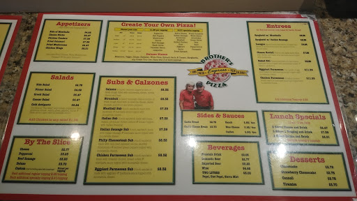 I have been going here since the first time someone turned me on to it which was in 2014. Ive gone so much, most of the staff know me by name and know what I want. The pizza is really good. I love pizza, especially New York style so if that is what you want and desire then this is your place. The atmosphere is nice and the staff is too. Ive never had a bad experience so no reason to stop going! I love you Brothers Pizza!