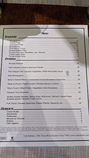 I love French foods. After spending a summer in Paris I began to love French food even more. I was looking for a restaurant in Texas to enjoy the "French Experience" again, it was then when I was introduced to Cafe Rabelais. From my first step in to my last step out I was extremely surprised that a restaurant of this small size could offer such great rapport in its everlasting impression. The staff has great knowledge in wine and the foods they serve. If you are looking for a fabulous restaurant and dining experience, Cafe Rabelais is the place you are lookiing for. 10 out of 10