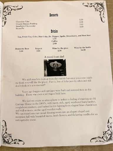 Very good food! You get huge portions of anything you order. It used to be an old antique store and they still have the old furniture and antique look in the restaurant. They have a ton of old carriage (hence the name) which my kids fond fascinating. If you go, try the country fried steak and mashed potatoes. Doesnt look like much from thr outside but definity a place to put on your list to try.