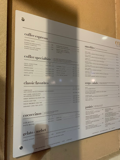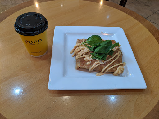 CoCos has great coffee, warm service, genuine housemade gelato, fantastic crepes, crusty BIG paninis, and a bargain of a salad with feta, almonds, fresh greens and a couple dollars more for huge amount of steamy chicken on top. Desserts are made by Mia Bellas bakery and brought in daily. Service is welcoming and speedy. Love this place because it has roomy tables to work or chat and plug-ins when powers running down. Opens early. The breakfast crepe with Morrocan sausage may be the perfect breakfast. Big enough to share if you feel generous and kind.