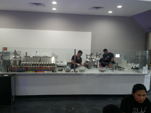The interior is very modern and nice to be at. The staff was very friendly upon entering and ordering. Using the iPad to order was very easy to follow. You can watch your ice cream being made from start to finish. I visited Dulcia with my brother and we were still able to get the grand opening promotion. We chose the strawberry geese cake with graham crackers and peach with mangos. Both were amazingly delicious! We definitely tasted each flavor/add on we chose. The regular size cup, for me, is the perfect amount after eating. I am definitely coming back for more of their other unique flavors.