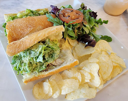 We came here on a Sunday for brunch/lunch. The place is in a strip mall which does not look that nice but the restaurant inside is very nice. We wanted to order quiches but they were out so we ordered sandwiches. My wife is vegetarian so we ordered the buffalo mozzarella sandwich and I ordered the tandoori salmon sandwich. My wife also ordered some kind of specialty coffee. Buffalo Mozzarella Sandwich - Wife and I didnt like it. It lacked a lot of flavor. The bread was also very hard to eat. Salmon Tandoori Sandwich - Was decent 3/5 Coffee - My wife really enjoyed the coffee Both sandwiches came with chips and salad. The chips were regular probably from a bag and the salad was very uninspired. Looks like form other photos that we got lettuce instead of spring mix/arugula. I think all the sandwiches are premade and taste that way. Overall we would not come back but looking at the other reviews the real stars here are the pastries. If I do come back and try them I will update my review. I think 30+ dollars for two sandwich combos and a coffee is steep.