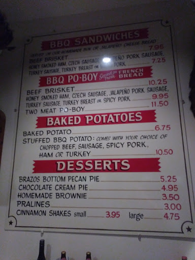 I went to this place for lunch one day during the week. It was busy but the line flew through. I ordered the 2-meat plate with 2 sides, so brisket/czech sausage with potato salad and jambalaya. the brisket on its own was good. tender, not dry, smoky taste. very nice. the sausauge was definitely made on site and used very coarsely ground meat, as oposed to a finer ground that you sometimes find. it was so coarsely ground that i felt funny eating the mystery meat that goes into sausauge. i wish it was just a tad more ground up. but still tasted great. that was the meat alone. the bbq sauce that was used on the meat was the worst part of the meal. it tasted like marinara sauce! where was the brown sugar, molasses, smokey, oniony taste of normal BBQ sauce?!? it really wasnt good. to the point where i dont want to go back there nor do i recommend it to others. the potato salad was good and had nice chunks of egg in it. very tasty. the jamabalaya was good too, though a bit dry if anything. i suggest other bbq places around town if you can avoid it.
