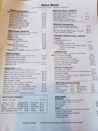 My first visit to Hanz Diner... Service was great, family friendly, very clean place - dont be worried about the location or outside view, just step inside and enjoy the warmth of a family feel. Food was great.. I ordered two eggs over medium, hashbrowns, bacon and toast.. big portions and very good. I will definitely be going back!