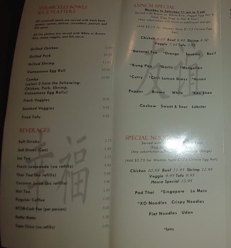 I love the food! I cant pick a favorite, its all good from the spring rolls, to the sesame chicken, to the vermicelli bowels, and Pho bowels! Havent tried anything I didnt like or love. They keep up with the place, nice decor, good ambiance, its clean, quaint, affordable, and the staff is nice, and the food is great! Wish it was a tad bigger to hold a little larger crowd of friends, but then they would have to expand, or close down till they renovated and Id miss it, and afraid theyd change it up too much. Hope it never changes!