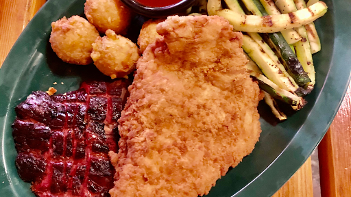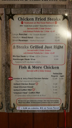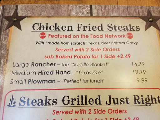 The one star is for the chicken fried steak. I thought they were supposed to be known for their delicious chicken fried steak??? I ended up feeding it to my dogs. The worst part was the gravy. What is it made from? Why is it yellow? It must be butter and chicken broth. It was so greasy as if the chicken fried steak isnt already greasy enough. The mashed potatoes were mediocre and again appeared to have that greasy yellow liquid they call gravy on it. The green beans were too salty and the corn appeared to have a sweetener added like sugar. Sweet corn doesnt need sweetening. My mother said, "someones mother did NOT know how to cook".