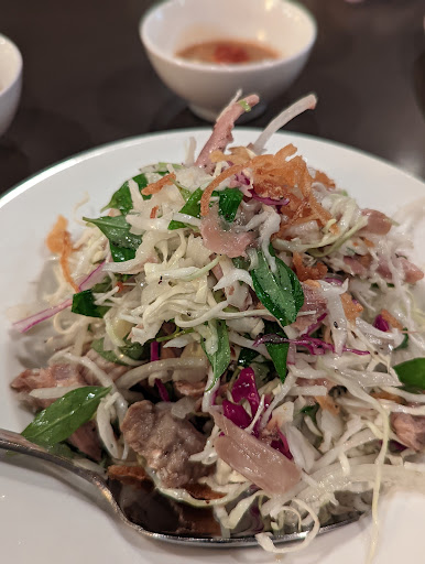 Crazy delicious! We found this place via Google Places and it turned out to be a gem! We had the duck salad - refreshing with lots of texture, and heavy on the flavor. The pho soup base was very flavorful - probably one of the best ones Ive had. The meat in the pho were really tender. I had the "Banh Cuon" - steamed rice paper with chargrilled pork which was really, really good: thin slices of chargrilled pork, fried onions, rolled in the softest rice paper, on a bed of fresh lettuce, cucumber, and carrots - everything was fresh & yummy! We had the flan + coffee syrup for dessert. The flan was melt-in-your-mouth good, the coffee adds just enough to add to the flan without overpowering it. The wait staff was friendly, attentive, but not hovering. It does get kinda loud in there. Definitely worth a visit!