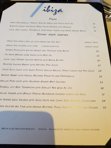 LOVED Ibiza. Highly recommend. The olive jar appetizer may sound odd, but I thoroughly enjoyed it and my taste buds were in Heaven. I was recommended by our super friendly waiter to have the ahi tuna steak, which was cooked perfectly. It came with a refreshing cucumber relish and seaweed salad. I was obsessed. My boyfriend got a shrimp plate, and I havent seen him smile so much during a meal in a long time. For dessert we ordered the pound cake and was the perfect ending to a perfect meal at our perfect date. They also had an extensive wine menu, but I wished I was a wine drinker so I could have enjoyed it! The restaurant itself was clean, minimalistic, and classy. Perfect ambiance for a nice date!