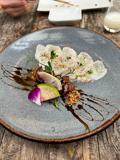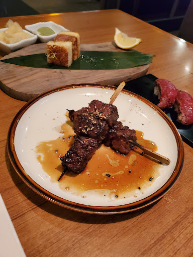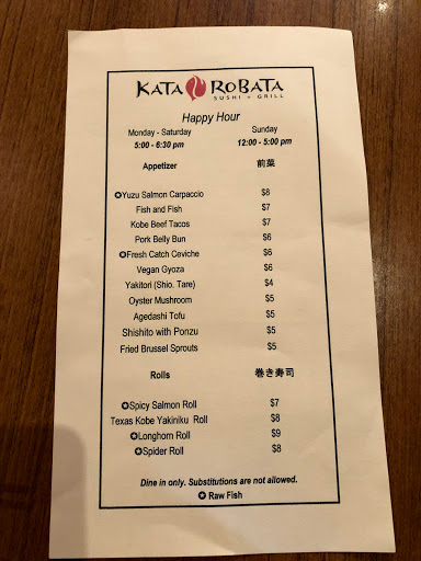 Loud environment and seriously fresh ingredients. Its odd how energetic and loud this place is but can also provide a nice intimate space (if you manage to get one). Regardless, the food is quite delicious and the ingredients really shine in both freshness and in taste. The menu is mostly Japanese-inspired seafood dishes with an infusion of western ingredients/style such as sashimi w/ foie gras or edamame gazpacho, but the focus is primarily on seafood. They are also known for their sushi and sashimi being some of the freshest (with some cuts of fish coming from as far as Japan) in Houston. When I visited I was able to try amber jack sashimi with foie gras, pan seared U-10 scallops, and a sushi plate. The amber jack and foie gras was simply divine, no literally, I thought I heard angels singing; the simple flavors of amber jack and the rich nuttiness of foie gras mingled so well that I had to stop and think about each bite. The pan seared scallops were lightly seared and cooked a little under done. The scallop had a firm texture but nice mild, sweet flavor and the sauce gave it more creamy, buttery appeal. The sushi was my least favorite but dont get me wrong it was good and better than some other sushi places but not my most favorite in Houston (Teppay being my Houston favorite). Overall, Kata Robata is a great Asian-fusion place to eat due to the food and environment especially for the young adult crowd. Prices range from $15-20 a plate. Side note: you need to RSVP for dinner otherwise youre going to be waiting for a long time also parking is horrible especially during peak dining hours.