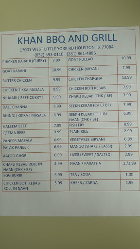 Chicken tikka masala tastes nothing like chicken soaked in tomato paste. I believe you need to develop a more mature palate if you feel that way. Khan BBQ although not much bbq..(chicken charga tho is off the chain) lol has amazing foods, my go to dishes: Karahi gosht Karahi chicken Nehari Daal Maash if they have it Their naans are the best in Houston... After your meal make sure you try that kheer... amazing or just split a chai with your friend and dip some if that left over naan in it.. phenomenal. One of the best places for Indo-Pak food in Htown.