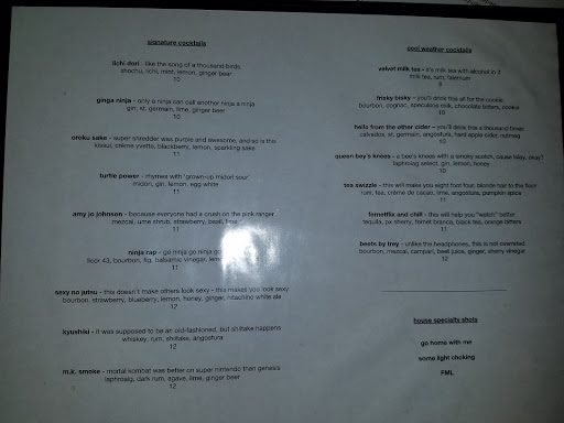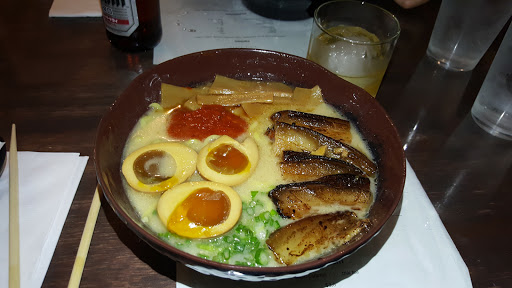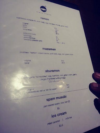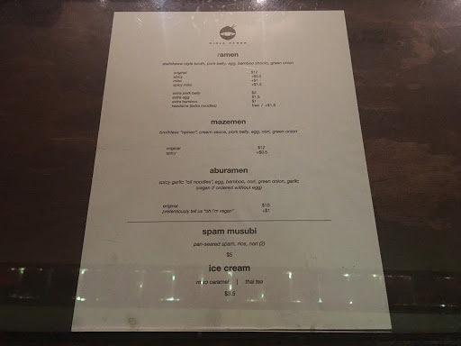 Im going to be honest. I didnt like Ninja Ramen at first but I gave it a second try and Im glad I did. The standard ramen is a bit on the more traditional side (i.e. basic but good): just bamboo shoots, noodles, egg, pork bell, green onions, and broth. The egg and porkbelly are spot on. Dont expect the more exotic hipster fusion ramen you find at Soma Sushi or Ramen Jin, both also good places, just different. At Ninja Ramen you start with this basic ramen at a reasonable price and then you can pay to get extras. I highly recommend you pay for the extras as it makes the meal much heartier. Adding the miso or spicy will change the flavor profile a bit. Im not sure if the miso is a true different broth or they just add miso to their regular broth. You ramen experts know what I am talking about. Extra noodles are free so dont be afraid to add that if you are hungry. Parking is a pain, dont park next to Ninja Ramen on Thompson St going northbound or you may get a ticket or towed. The place is a bit of a dive and the interior is black and red with sparse ninja themed items on the wall and ninja stuff playing on the TV. The waitstaff is friendly and chill and fits with a dive bar, no complaints.