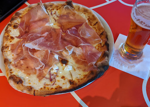 We had the Capricciosa and the Lisbona pizzas here. Both were terrible and massively over-priced for the quality ($23pp). I believe this is supposed to be a Neapolitan thin style pizza but its hard to tell given how crappy the crust is: it might be a restaurant version of a frozen pizza. The crusts are tough, chewy, flat disks of dough that managed to be both overcooked and uncooked. Some very mild charring on the bottom and none on the top. Imagine an unsweetened shortbread cookie - it looks that pale and that dense/flat only chewy and tough. There is no appreciable lip on the edges. For pizzaphiles: zero oven spring, no cornicione, no hole structure, no leopard spotting. Try Pizaros if you want a good Neapolitan style pizza The problem appears to be an under-powered or over-stuffed oven with none of the pizzas hitting the floor at the right temperature. You could tell by the gradient of overcooked to under-cooked from one end of one pizza to the other. I would have sent it back but the waitress would go missing for 10 minutes at a time and I wanted to go eat somewhere better. Left half of it on the plate. . Fun looking place though. Wish the execution was better.