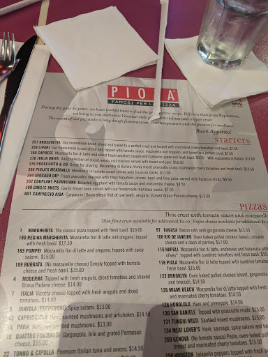 After having visited Naples recently, we were hoping to get a taste of that same style of Pizza here in Houston. While Piolas pizza is OK, its just lacking something, perhaps some olive oil on the crust and maybe some salt in the sauce. We found it quite bland, and it wasnt hot or even warm when it reached our table. Also, they were really stingy with the fresh basil. I got only 3 small leaves on the whole pizza. In addition to pizza, we had the caprese salad as an appetizer. Surprisingly, it was more of a make-your-own caprese kit. We were given a ball of mozzarella on a plate, surrounded by plain tomato slices, four small basil leaves, and bottles of olive oil and balsamic vinegar. It was OK, but Ive always had it already marinated and served at room temperature. Another oddity we found at Piola was chilled red wine. We had one glass each, and it was ice cold--not good. On a positive note, the atmosphere is great, at least when the restaurant isnt busy. While the guy working at the door was really complacent and looked as though hed rather be anywhere other than there, our server was EXCELLENT. She was both friendly and superbly attentive. We tipped her very well. I cant imagine having cravings for Piola, but I wouldnt be surprised if I end up there again someday.