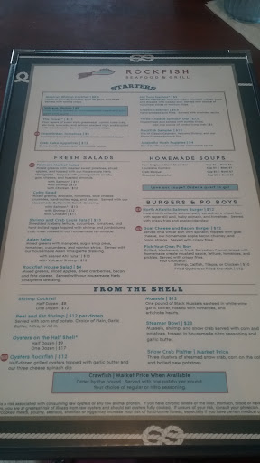 My husband and I really like this place. Youre promptly greeted by the hostess, when you walk in the door, and the great service continues with your server. More often that not, a manager will probably stop by your table to make sure everythings OK. We especially like The Tower, Ahi Tuna Nachos, Crab Bisque and the Stuffed Flounder. However, from what Ive seen of the dishes at neighboring tables, everything looks amazing. Rockfish is one of those restaurants that just has a really comfortable atmosphere and great food that will keep you coming back, whether its to celebrate a special occasion or a quick bite during the week to keep from having to cook. I highly recommend giving it a try.